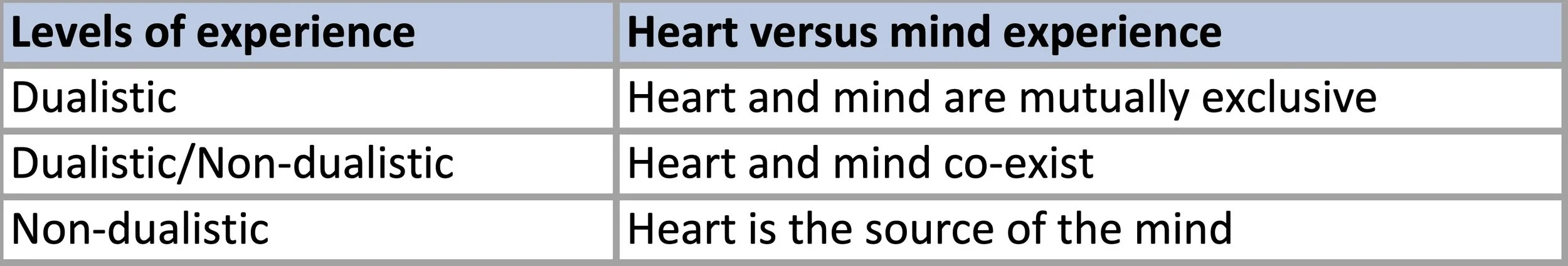 Over time, as we function more and more from the heart, we begin to move away from dualistic experience of the seeming friction between the heart and mind. We begin to be mostly open while the mind continues to function in the background. Nathaji describes that as a radio station. We tune into the station of the Heart FM 108, while the mind is doing its thing on FM 88, but it does not affect us as much. Both the heart and mind function simultaneously but the mind does not bother us as much. We are so busy being in the heart, operating from a higher resonance, that the mind is just a minor annoyance. This is both a dualistic and non-dualistic understanding.